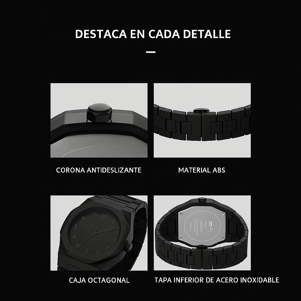 Reloj versátil adecuado tanto para ocasiones informales como formales con su sofisticada combinación de colores completamente negro.
